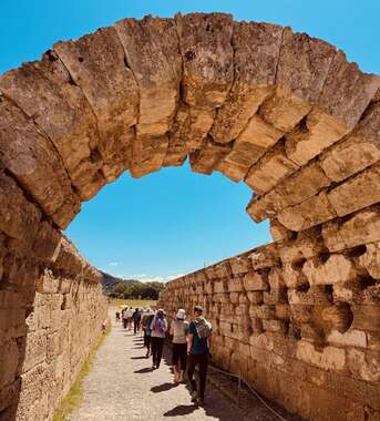 In addition to this stupendous experience, we spend time inside the archaeological Museum of Olympia, which contains famous sculptures of Hermes of Praxiteles and the sculptural decoration of the temple of Zeus. It’s a gorgeous place. Afterwards, we walk to a sweet little village bordering Olympia to enjoy a picturesque outdoor lunch — this program is a feast of local dishes each and every day — before getting back on the road.